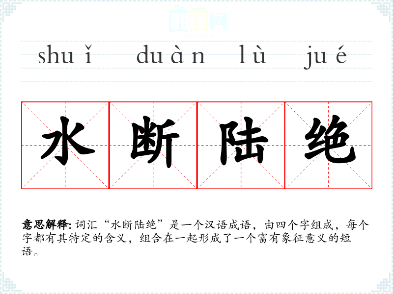 词汇“水断陆绝”是一个汉语成语,由四个字组成,每个字都有其特定的含义,组合在一起形成了一个富有象征意义的短语。