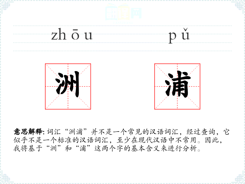 词汇“洲浦”并不是一个常见的汉语词汇,经过查询,它似乎不是一个标准的汉语词汇,至少在现代汉语中不常用。因此,我将基于“洲”和“浦”这两个字的基本含义来进行分析。