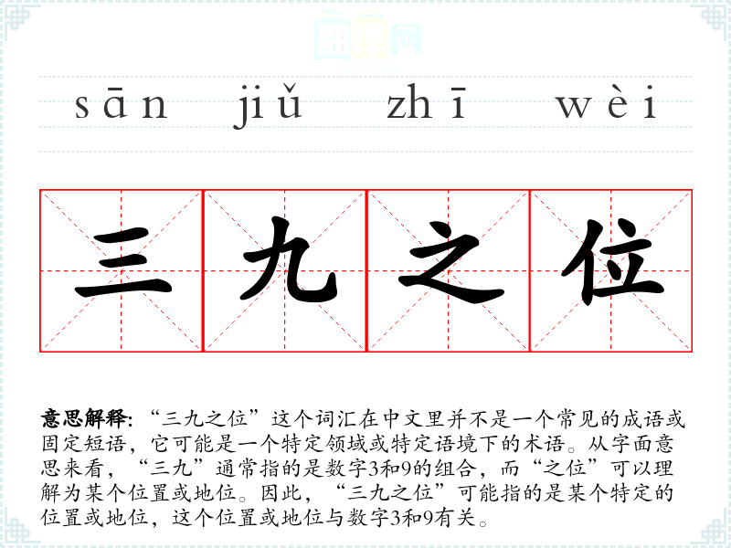由于“三九之位”不是一个常见的词汇,它在不同语言或文化中的对应词汇可能不明确。在其他文化中,可能没有直接对应的词汇来描述这种特定的位置或地位。