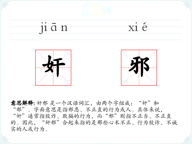 奸邪 是一个汉语词汇,由两个字组成:“奸”和“邪”。字面意思是指邪恶、不正直的行为或人。具体来说,“奸”通常指狡诈、欺骗的行为,而“邪”则指不正当、不正直的。因此,“奸邪”合起来指的是那些心术不正、行为狡诈、不诚实的人或行为。