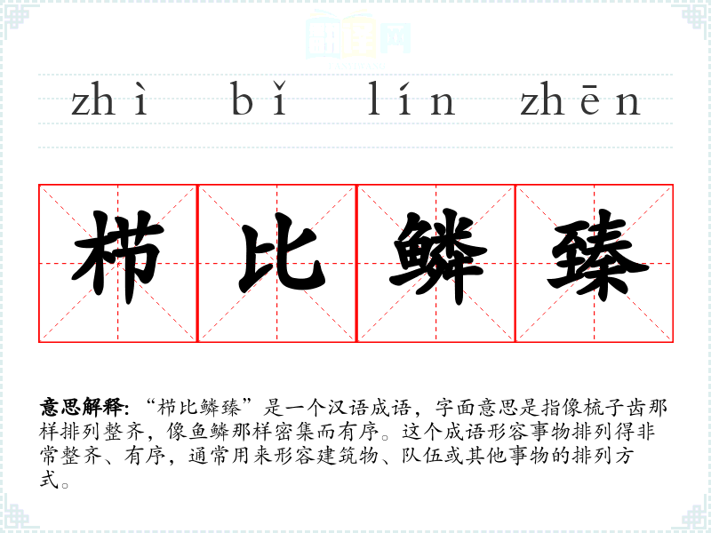 “栉比鳞臻”是一个汉语成语,字面意思是指像梳子齿那样排列整齐,像鱼鳞那样密集而有序。这个成语形容事物排列得非常整齐、有序,通常用来形容建筑物、队伍或其他事物的排列方式。