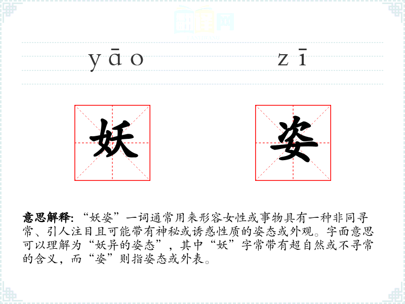 “妖姿”一词的词源可以追溯到古代汉语,其中“妖”字最初可能与妖怪或超自然现象有关,后来逐渐用来形容非同寻常或引人注目的事物。随着时间的推移,这个词的使用范围和含义也有所扩展和变化。