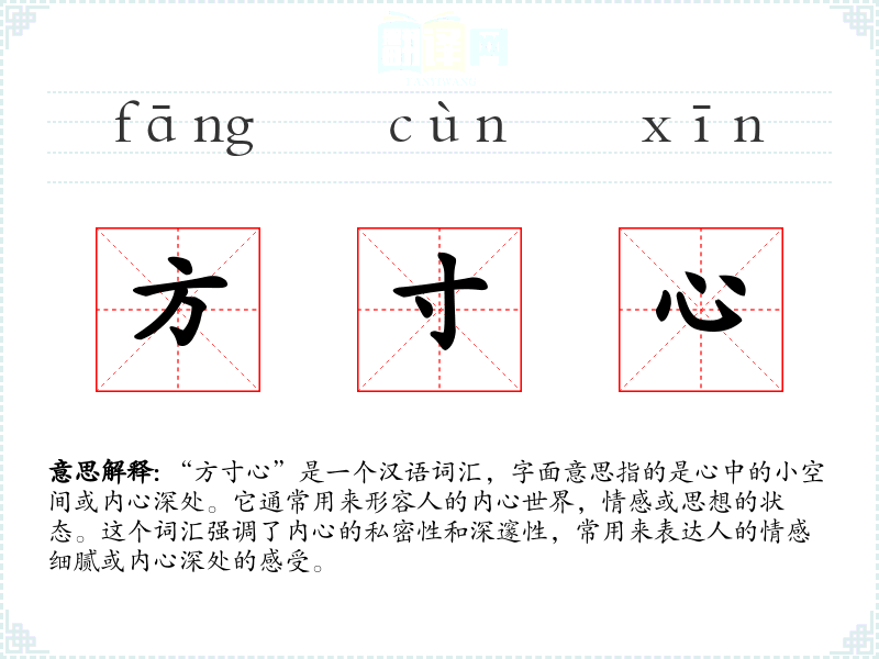 “方寸心”这个词汇源自古代汉语,其中“方寸”原指小方形的面积,后来引申为内心的空间。在古代文学中,这个词汇就已经被用来形容人的内心世界。随着时间的推移,这个词汇的用法和含义基本保持稳定,但在现代汉语中,它的使用频率可能有所下降。