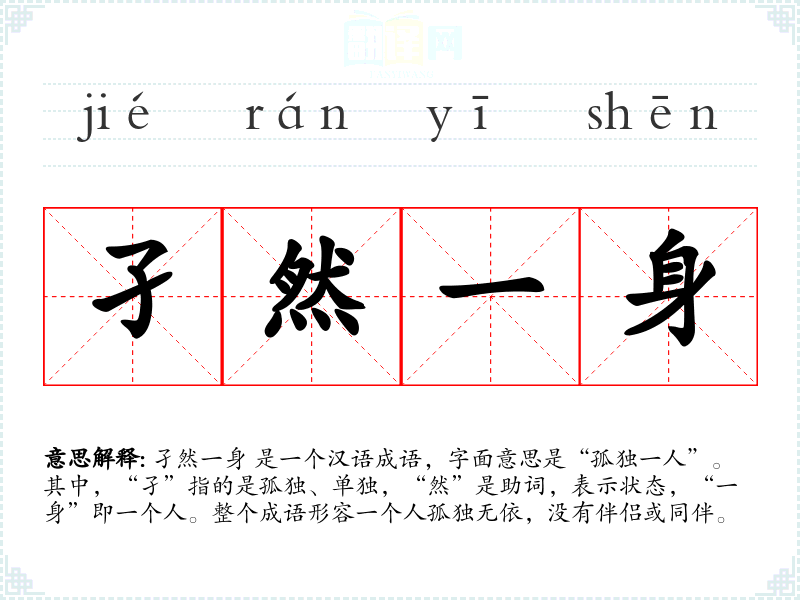 孑然一身 是一个汉语成语,字面意思是“孤独一人”。其中,“孑”指的是孤独、单独,“然”是助词,表示状态,“一身”即一个人。整个成语形容一个人孤独无依,没有伴侣或同伴。