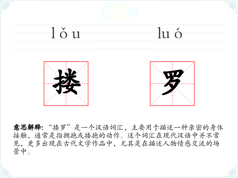“搂罗”是一个汉语词汇,主要用于描述一种亲密的身体接触,通常是指拥抱或搂抱的动作。这个词汇在现代汉语中并不常见,更多出现在古代文学作品中,尤其是在描述人物情感交流的场景中。