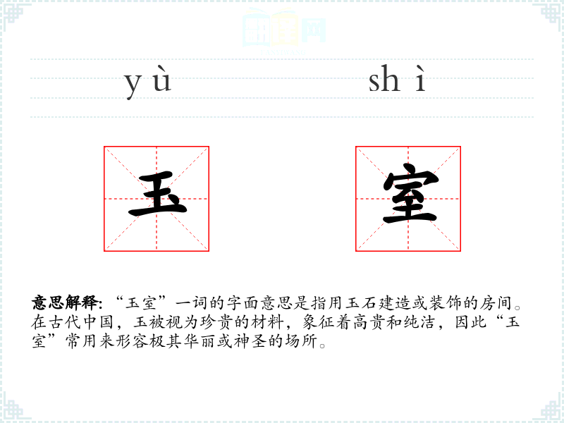 “玉室”一词的字面意思是指用玉石建造或装饰的房间。在古代**,玉被视为珍贵的材料,象征着高贵和纯洁,因此“玉室”常用来形容极其华丽或神圣的场所。