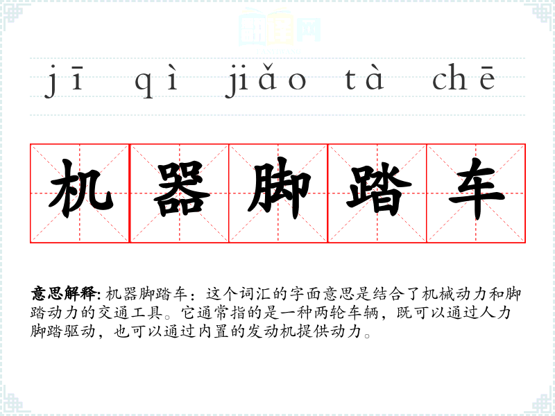 机器脚踏车:这个词汇的字面意思是结合了机械动力和脚踏动力的交通工具。它通常指的是一种两轮车辆,既可以通过人力脚踏驱动,也可以通过内置的发动机提供动力。