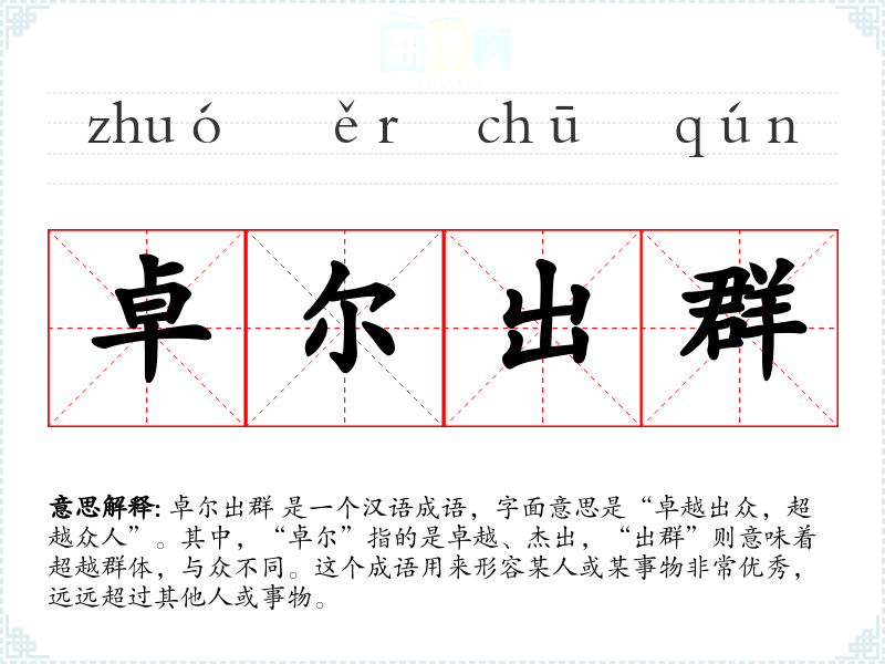 卓尔出群 是一个汉语成语,字面意思是“卓越出众,超越众人”。其中,“卓尔”指的是卓越、杰出,“出群”则意味着超越群体,与众不同。这个成语用来形容某人或某事物非常优秀,远远超过其他人或事物。