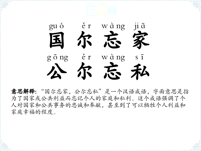 “国尔忘家,公尔忘私”是一个汉语成语,字面意思是指为了国家或公共利益而忘记个人的家庭和私利。这个成语强调了个人对国家和公共事务的忠诚和奉献,甚至到了可以牺牲个人利益和家庭幸福的程度。