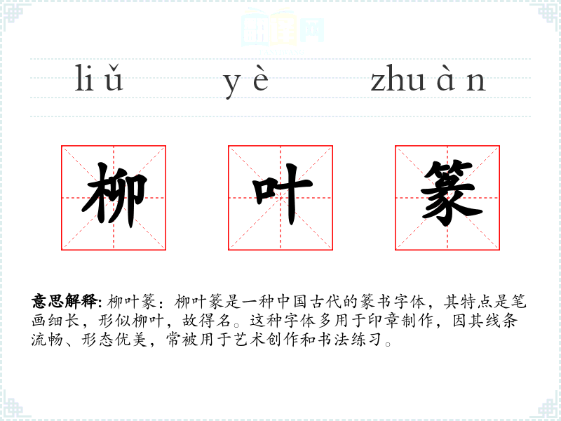 - 文学:在文学作品中,柳叶篆可能被提及作为古代文化的象征,或者在描述古代文人墨客的生活时出现。