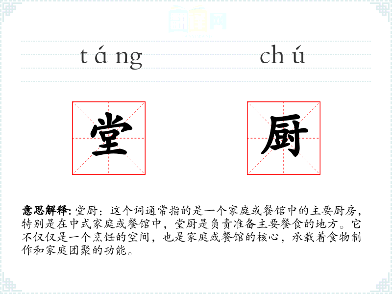 堂厨:这个词通常指的是一个家庭或餐馆中的主要厨房,特别是在中式家庭或餐馆中,堂厨是负责准备主要餐食的地方。它不仅仅是一个烹饪的空间,也是家庭或餐馆的核心,承载着食物制作和家庭团聚的功能。