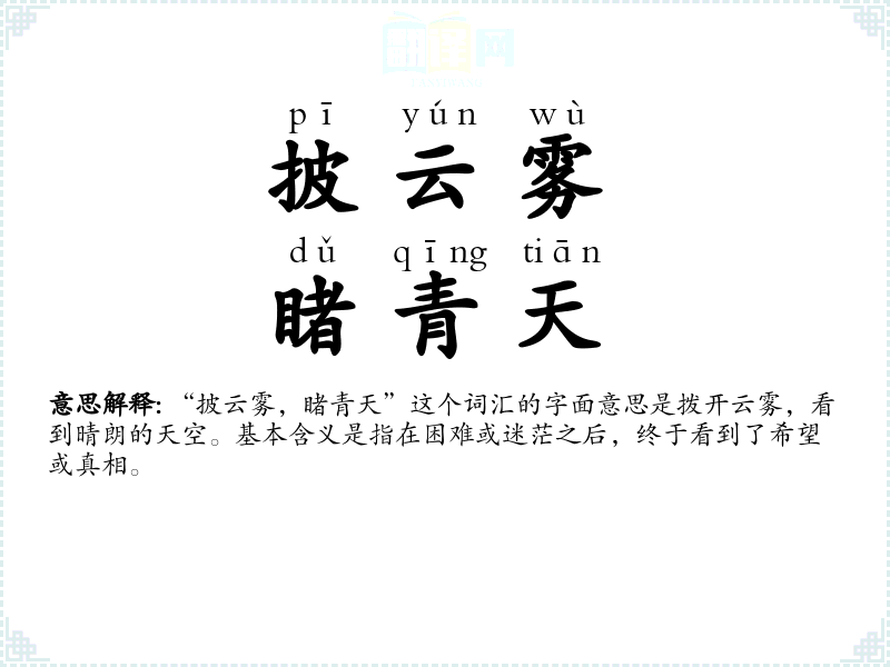 这个词汇的词源较为直观,由“披”、“云雾”、“睹”、“青天”四个字组成,每个字都有其明确的意义。在历史演变中,这个词汇一直保持着其基本的比喻意义,即在困难后看到希望。