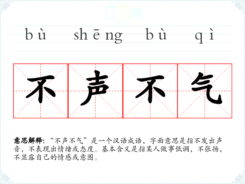 “不声不气”是一个汉语成语,字面意思是指不发出声音,不表现出情绪或态度。基本含义是指某人做事低调,不张扬,不显露自己的情感或意图。