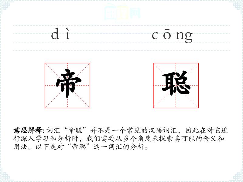 词汇“帝聪”并不是一个常见的汉语词汇,因此在对它进行深入学*和分析时,我们需要从多个角度来探索其可能的含义和用法。以下是对“帝聪”这一词汇的分析: