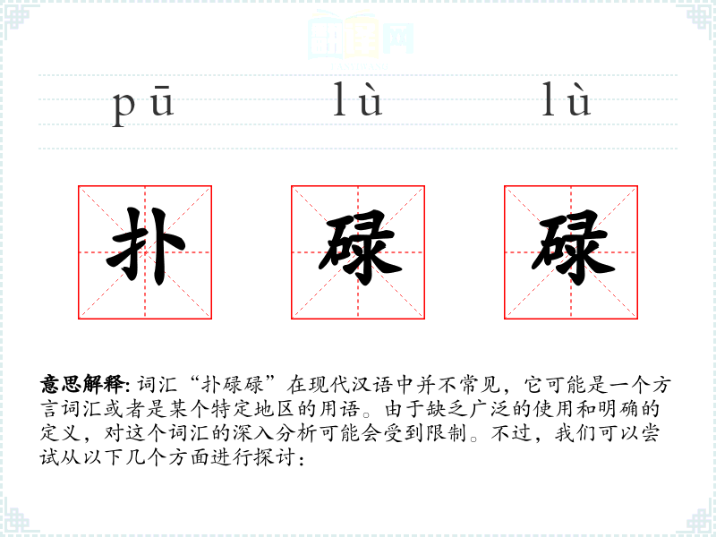 词汇“扑碌碌”在现代汉语中并不常见,它可能是一个方言词汇或者是某个特定地区的用语。由于缺乏广泛的使用和明确的定义,对这个词汇的深入分析可能会受到限制。不过,我们可以尝试从以下几个方面进行探讨: