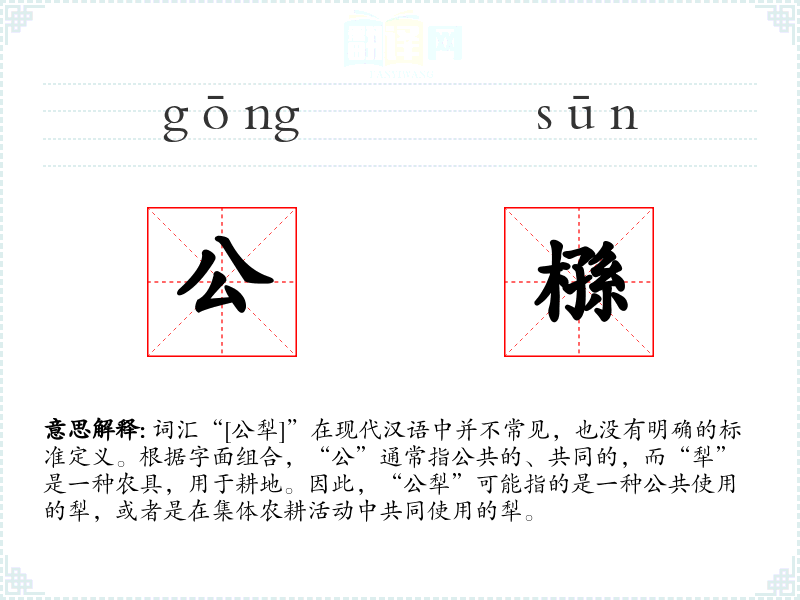 - 由于“公犁”不是一个常用词汇,其词源和演变不详。可能是由“公”和“犁”两个常用词汇组合而成。