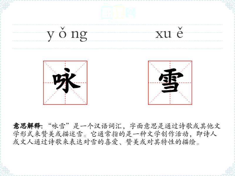 “咏”字源自古代汉语,意为歌唱或吟咏,而“雪”则是指自然界中的雪。两者结合,形成了“咏雪”这一词汇,用以描述通过诗歌来表达对雪的情感。