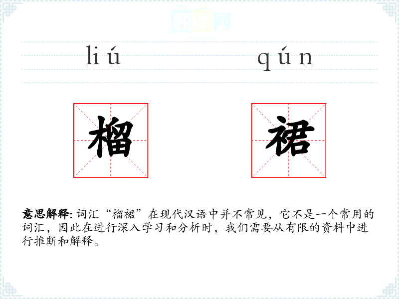 词汇“榴裙”在现代汉语中并不常见,它不是一个常用的词汇,因此在进行深入学习和分析时,我们需要从有限的资料中进行推断和解释。