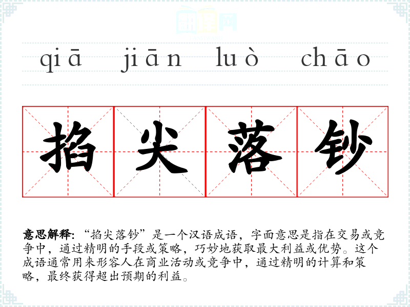 “掐尖落钞”是一个汉语成语,字面意思是指在交易或竞争中,通过精明的手段或策略,巧妙地获取最大利益或优势。这个成语通常用来形容人在商业活动或竞争中,通过精明的计算和策略,最终获得超出预期的利益。