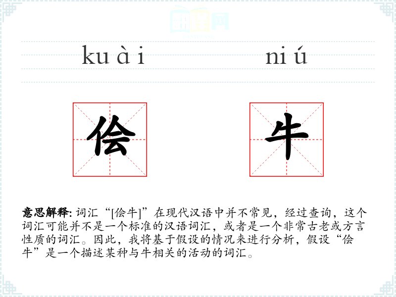 词汇“[侩牛]”在现代汉语中并不常见,经过查询,这个词汇可能并不是一个标准的汉语词汇,或者是一个非常古老或方言性质的词汇。因此,我将基于假设的情况来进行分析,假设“侩牛”是一个描述某种与牛相关的活动的词汇。