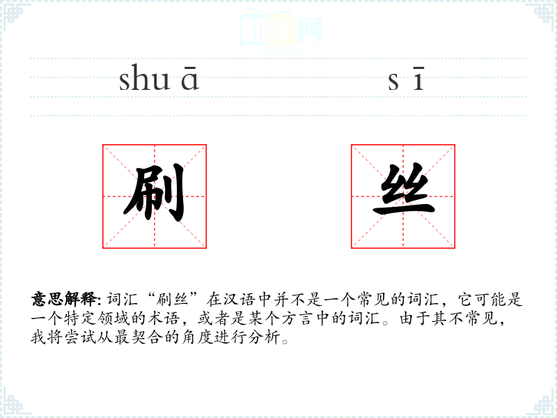 词汇“刷丝”在汉语中并不是一个常见的词汇,它可能是一个特定领域的术语,或者是某个方言中的词汇。由于其不常见,我将尝试从最契合的角度进行分析。