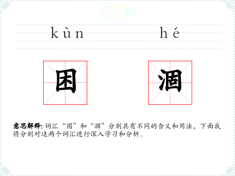 词汇“困”和“涸”分别具有不同的含义和用法,下面我将分别对这两个词汇进行深入学习和分析。