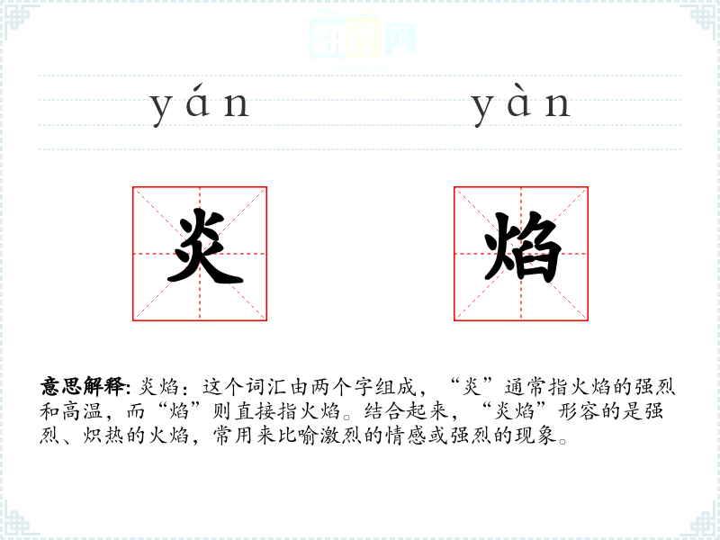 “炎”字在古代汉语中已有火焰的意思,而“焰”字则更直接地指火焰。两个字结合使用,强化了火焰的强烈和炽热感。在现代汉语中,“炎焰”的使用相对较少,更多地出现在文学作品或特定的语境中。