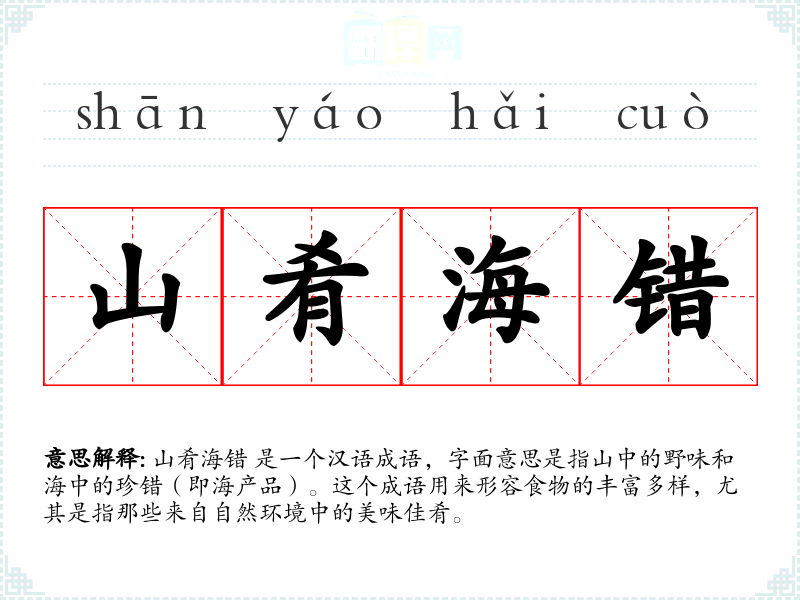 山肴海错 是一个汉语成语,字面意思是指山中的野味和海中的珍错(即海产品)。这个成语用来形容食物的丰富多样,尤其是指那些来自自然环境中的美味佳肴。