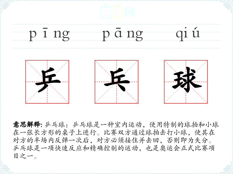 - 同义词:桌球(直接指代乒乓球)、ping-pong(乒乓球的英文音译)