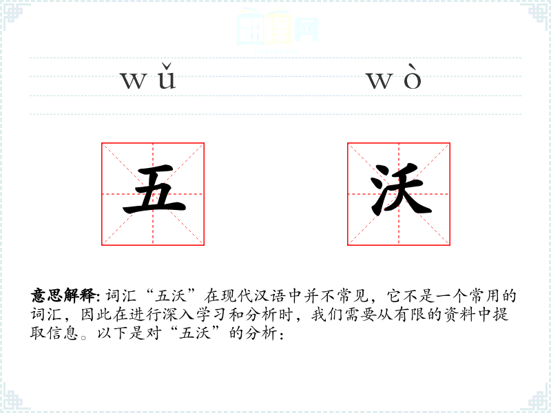 词汇“五沃”在现代汉语中并不常见,它不是一个常用的词汇,因此在进行深入学*和分析时,我们需要从有限的资料中提取信息。以下是对“五沃”的分析: