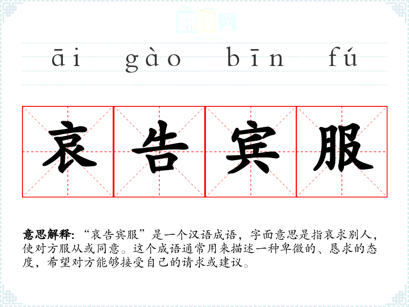 “哀告宾服”是一个汉语成语,字面意思是指哀求别人,使对方服从或同意。这个成语通常用来描述一种卑微的、恳求的态度,希望对方能够接受自己的请求或建议。