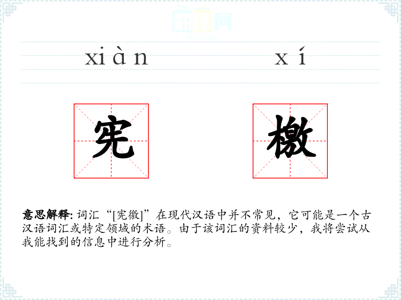 词汇“[宪徼]”在现代汉语中并不常见,它可能是一个古汉语词汇或特定领域的术语。由于该词汇的资料较少,我将尝试从我能找到的信息中进行分析。