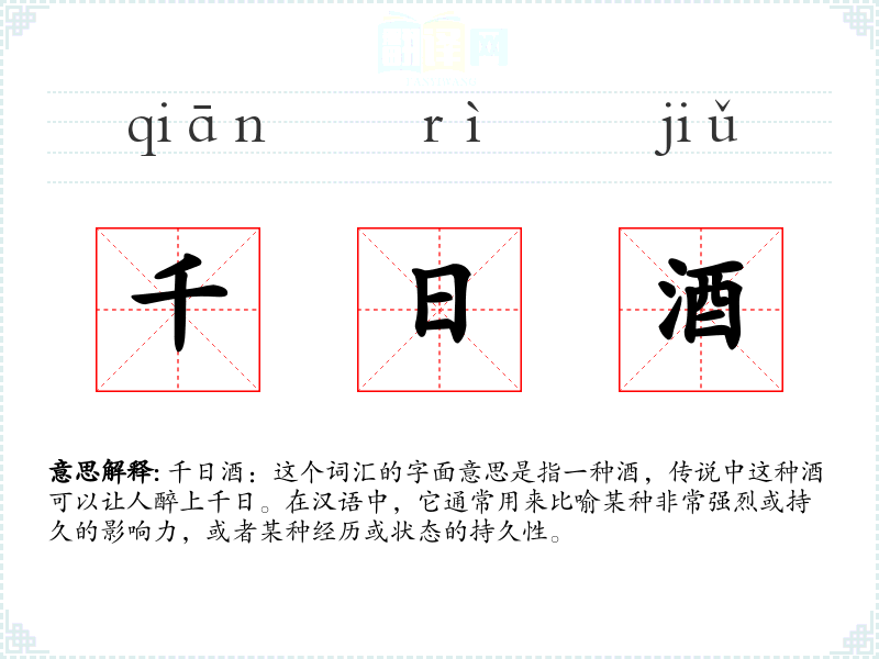 千日酒:这个词汇的字面意思是指一种酒,传说中这种酒可以让人醉上千日。在汉语中,它通常用来比喻某种非常强烈或持久的影响力,或者某种经历或状态的持久性。