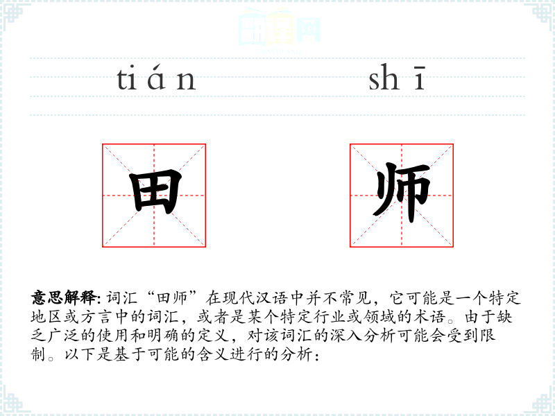 “田师”字面意思可能是指在田地工作的人,特别是那些有经验、技术或知识的农业工作者。在某些方言或地区,可能指的是农业技术员或农业顾问。