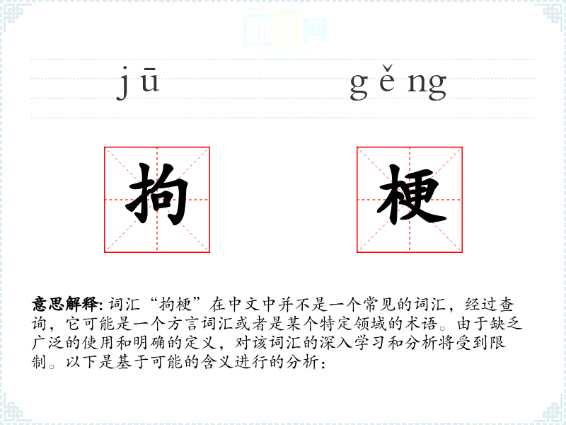 词汇“拘梗”在中文中并不是一个常见的词汇,经过查询,它可能是一个方言词汇或者是某个特定领域的术语。由于缺乏广泛的使用和明确的定义,对该词汇的深入学习和分析将受到限制。以下是基于可能的含义进行的分析: