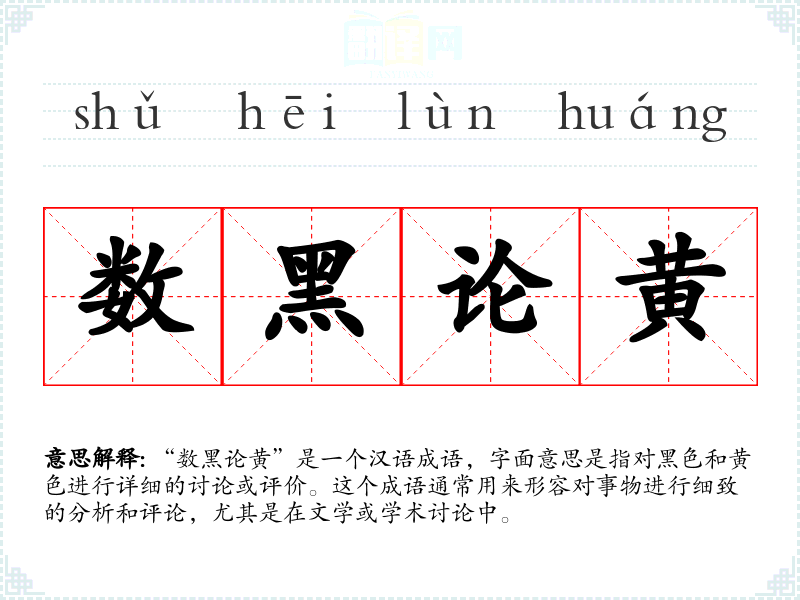 “数黑论黄”是一个汉语成语,字面意思是指对黑色和黄色进行详细的讨论或评价。这个成语通常用来形容对事物进行细致的分析和评论,尤其是在文学或学术讨论中。