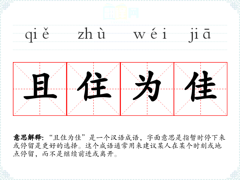 “且住为佳”是一个汉语成语,字面意思是指暂时停下来或停留是更好的选择。这个成语通常用来建议某人在某个时刻或地点停留,而不是继续前进或离开。