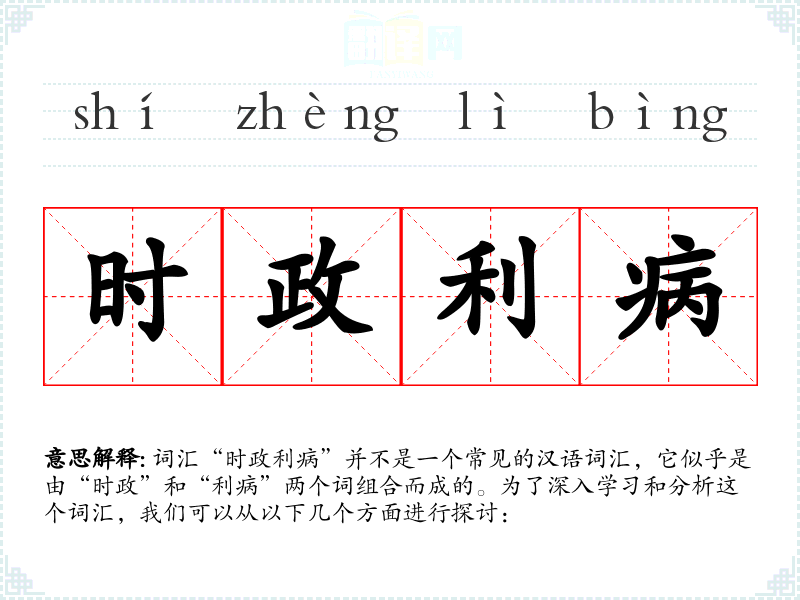 词汇“时政利病”并不是一个常见的汉语词汇,它似乎是由“时政”和“利病”两个词组合而成的。为了深入学*和分析这个词汇,我们可以从以下几个方面进行探讨: