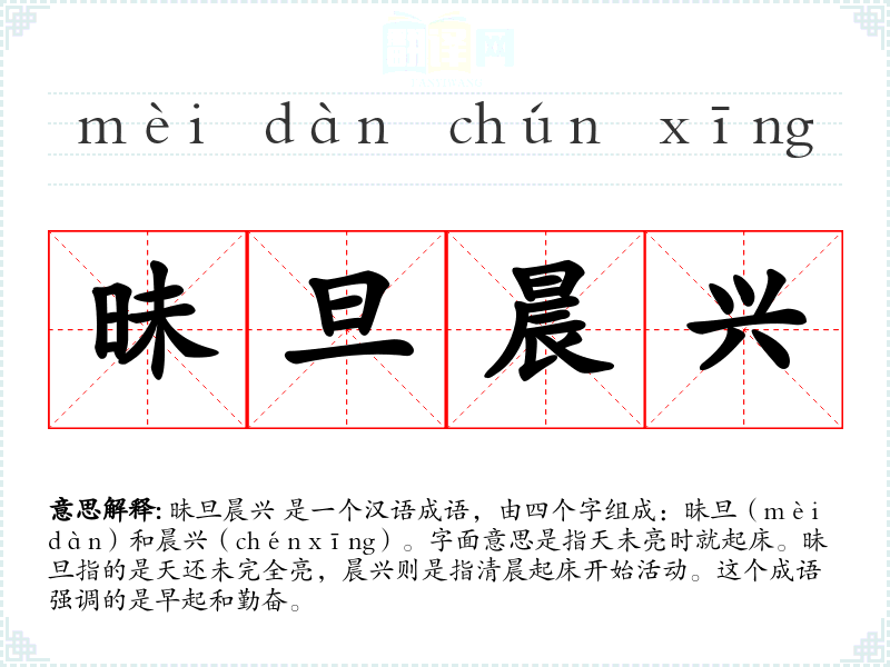 昧旦晨兴 是一个汉语成语,由四个字组成:昧旦(mèi dàn)和晨兴(chén xīng)。字面意思是指天未亮时就起床。昧旦指的是天还未完全亮,晨兴则是指清晨起床开始活动。这个成语强调的是早起和勤奋。