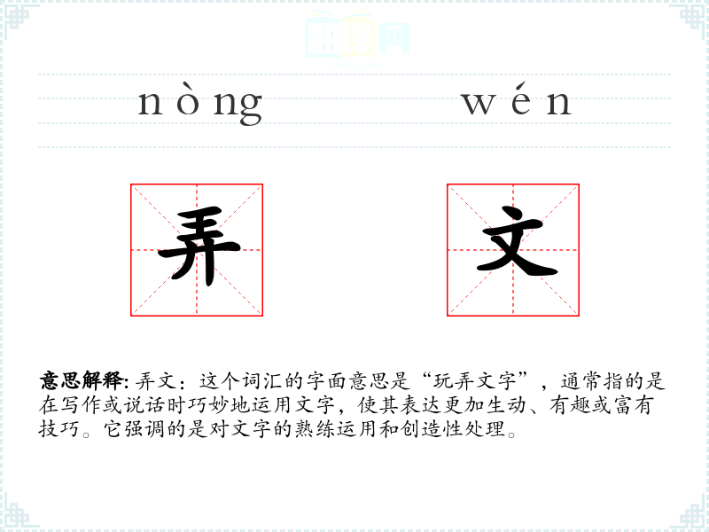 弄文:这个词汇的字面意思是“玩弄文字”,通常指的是在写作或说话时巧妙地运用文字,使其表达更加生动、有趣或富有技巧。它强调的是对文字的熟练运用和创造性处理。