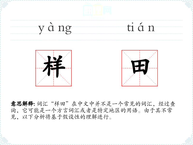 词汇“样田”在中文中并不是一个常见的词汇,经过查询,它可能是一个方言词汇或者是特定地区的用语。由于其不常见,以下分析将基于假设性的理解进行。