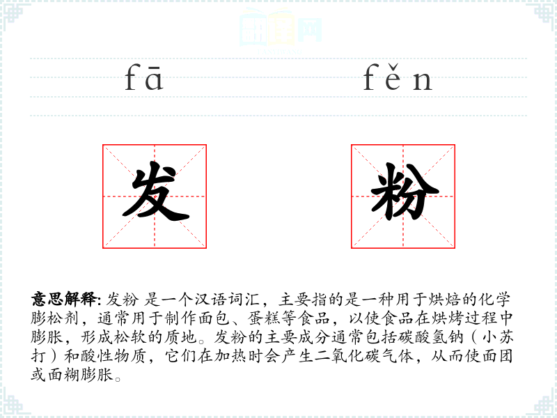在烹饪和烘焙领域,发粉 是一个专业术语,用于描述一种特定的食品添加剂。在日常生活中,人们可能会在讨论烘焙食谱或食品制作时提到发粉。在文学作品中,发粉可能不会直接出现,但与烘焙相关的场景可能会间接提及。