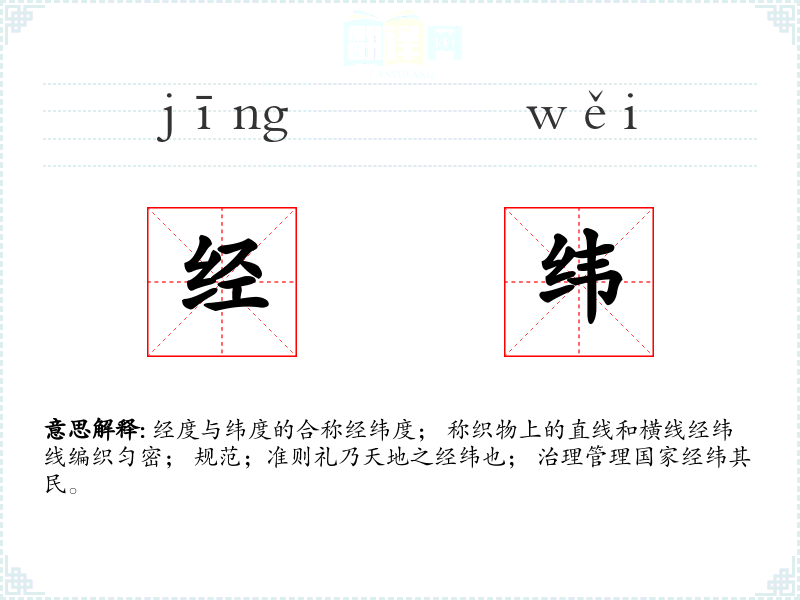 经度与纬度的合称经纬度; 称织物上的直线和横线经纬线编织匀密; 规范;准则礼乃天地之经纬也; 治理管理国家经纬其民。