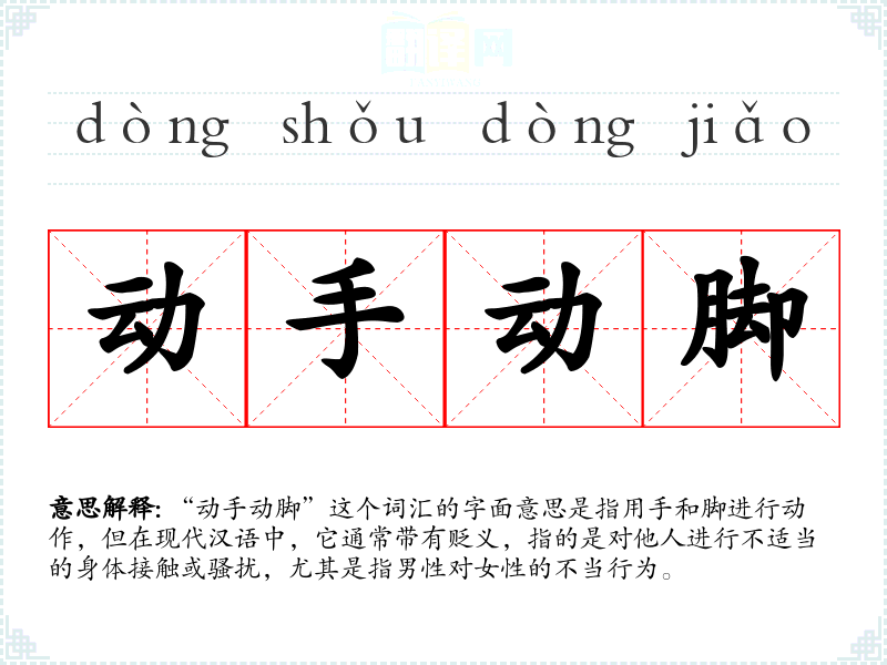 “动手动脚”这个词汇的字面意思是指用手和脚进行动作,但在现代汉语中,它通常带有贬义,指的是对他人进行不适当的身体接触或骚扰,尤其是指男性对女性的不当行为。