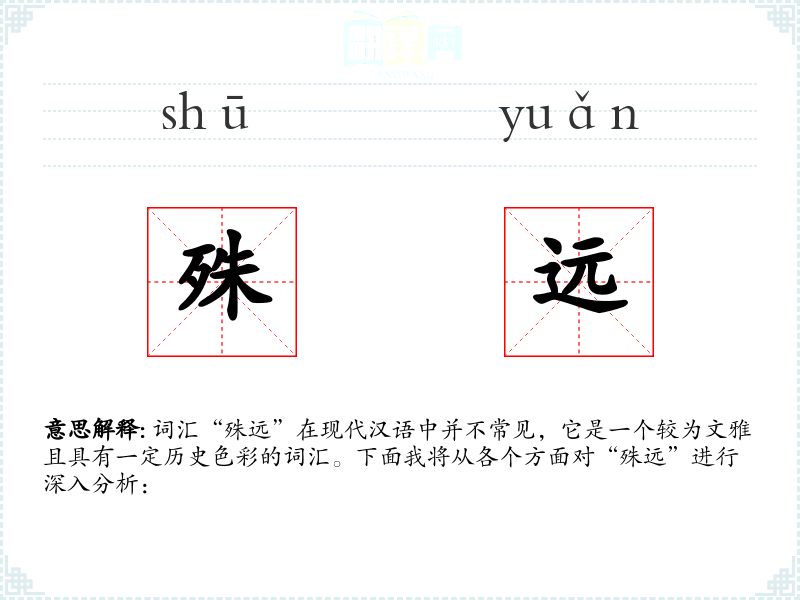 词汇“殊远”在现代汉语中并不常见,它是一个较为文雅且具有一定历史色彩的词汇。下面我将从各个方面对“殊远”进行深入分析: