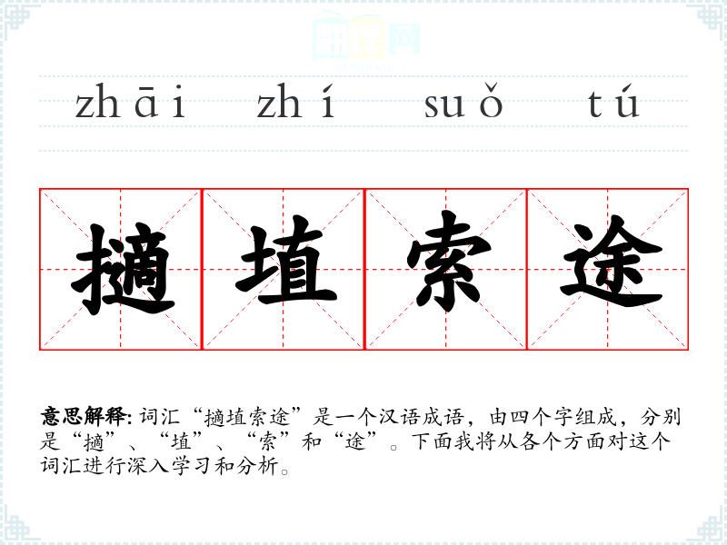 词汇“擿埴索途”是一个汉语成语,由四个字组成,分别是“擿”、“埴”、“索”和“途”。下面我将从各个方面对这个词汇进行深入学*和分析。
