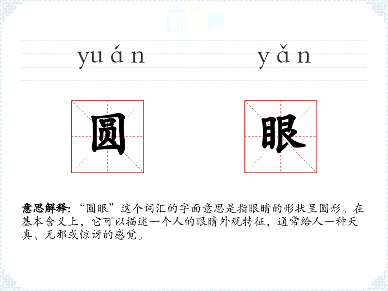“圆眼”这个词汇的字面意思是指眼睛的形状呈圆形。在基本含义上,它可以描述一个人的眼睛外观特征,通常给人一种天真、无邪或惊讶的感觉。
