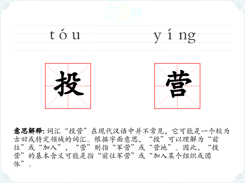 词汇“投营”在现代汉语中并不常见,它可能是一个较为古旧或特定领域的词汇。根据字面意思,“投”可以理解为“前往”或“加入”,“营”则指“军营”或“营地”。因此,“投营”的基本含义可能是指“前往军营”或“加入某个组织或团体”。