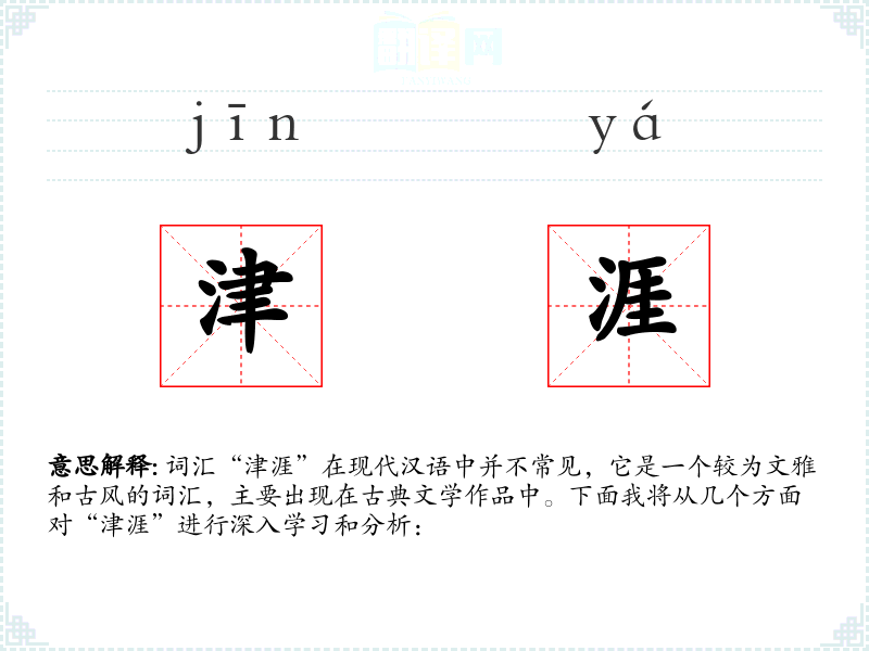 词汇“津涯”在现代汉语中并不常见,它是一个较为文雅和古风的词汇,主要出现在古典文学作品中。下面我将从几个方面对“津涯”进行深入学*和分析: