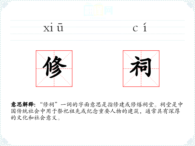“修祠”一词的字面意思是指修建或修缮祠堂。祠堂是**传统社会中用于祭祀祖先或纪念重要人物的建筑,通常具有深厚的文化和社会意义。